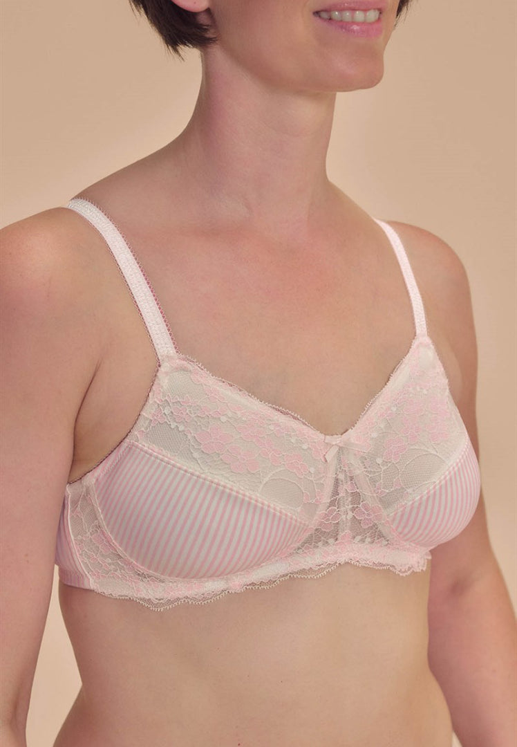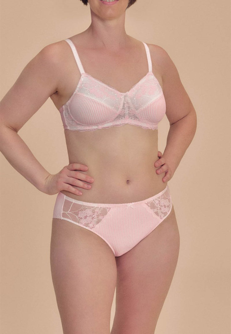 El sujetador sin aros Amoena Kennie en rosa empolvado/blanco roto es una opción suave y cómoda para mujeres que usan prótesis o moldeadores de pecho. Fabricado con copas sin relleno y sin aros, proporciona una silueta natural y una sujeción ligera durante todo el día.